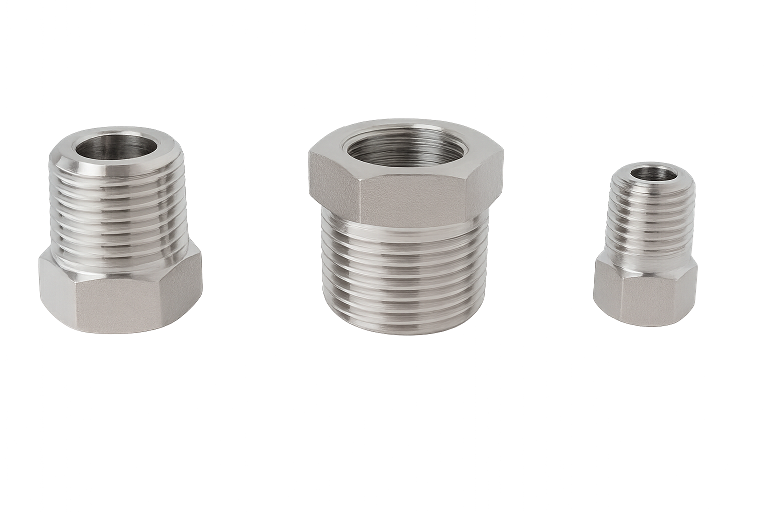- Переход между разными размерами и стандартами резьбы (NPT, ISO, метрическая, SAE/MS)